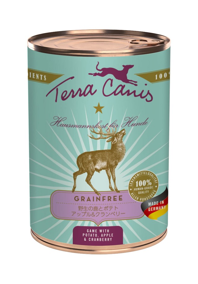 手作りの安心・優しさ・おいしさを手軽にご家庭で Terra Canis★Home Style cooking for dogs Terra Canisは本物のヒューマングレードを提供します。 その品質基準は「ヒューマンクオリティー」(人間用食材品質) 従来基準の1つであるヒューマングレード品質と一線を画し、 ヨーロッパで、また世界で新しい品質基準の革命の風を起こしています。 近年ドイツでヒューマングレードの代名詞といえばTerra Canis(テラカニス)です。ドイツ国内では約1300件の専門店で販売され、わずか12年でヒューマングレードフード市場の国内トップシェアクラスになったパートナーのためのご飯です。 なぜトップシェアクラスになれたか? Terra Canisが使用している原料は全て人間用食材です。それを可能にしたのはTerra Canisがドイツ ミュンヘンにある人間用食品加工会社でミュンヘン オクトーバーフェストのホストを何十年も続ける3代続く伝統的なお肉屋さん(ブッチャー)だからです。Terra Canisはお肉屋さんにしか作れないデリカテッセ(パートナーのための美味しいご飯)を調理しました。 本来人間と同品質とは、「人が食べる」品質を指します それは鮮度や品質等の安全基準をクリアし人間用の肉や加工物に適した全ての食肉処理されたものを指します。 この基準は非常に厳しい衛生規制があります。例えば肉の細菌数が限界値を超えた場合、人間の食用としては使用されず廃棄しなければなりません。そうなると、もともとは食肉であっても我々人間の食用には適しません。Terra Canisの原料はオープンで原材料や使用部位を透明化し、第3カテゴリー原料(人間が食べる部位を取った後の残りや廃棄部位)や、新鮮ではなく食用に適さない原料を使用しません。 Terra Canisは食肉の食品会社ですので人間の食用品質の原料のみを保管し製造します。そのため、原料だけでなく製造工程も人が食べる商品と同じクオリティを保っているのです。きれいなお肉がその場でミンチされ野菜もその場でカット、新鮮なまま缶に入れ減圧、加熱するシンプルな製法です。ですから製造工場は腐敗臭など全くせず、まるで家庭でクッキングしているようなごちそうが次々と生まれます。 そもそもこの製品はペットフードメーカーがペットフードの基準で製品を作ったのではなく製造後、製品ラベルを貼った時に初めてパートナーのための食事になります。 「人間の食用と同じもの(ヒューマンクオリティー)=Terra Canis ホームメイドスタイルのデリカテッセ(美味しいご飯)、ペーストタイプのサプリメント、お肉やお野菜の缶詰もご用意しました。日々の楽しいご飯として、手作りご飯の材料として、またお気に入りのフードとミックスできる商品も併せてお楽しみください。 [コンプリート食] テラカニス グレインフリー 鹿肉は、すべての成犬にうれしい、栄養価の高い食事です。穀物や乳製品を含まないので、アレルギーのある犬にも適しています。原料は全てヒューマングレード(人間用食品)で、愛犬の健康をしっかりと考えています。 鹿肉を59%使用し、野菜や果物、ハーブを38%加えることで、愛犬に必要な栄養素をバランスよく届けます。また、カルシウム補給には有機卵殻の粉を使用しています。ドイツ・バイエルンの伝統的な肉屋で製造されており、高品質な食材を大切にした手作りの理想形です。 鹿肉には高品質なタンパク質が豊富に含まれ、愛犬の健康維持や筋肉のサポートに役立ちます。様々な野菜や果物も取り入れたことで、栄養素が豊富な食事を実現しています。 [原材料] 鹿の筋肉 (55%)、にんじん、ズッキーニ、ジャガイモ (8%)、パースニップ*、リンゴ (4%)、レープシードオイル、ココナッツ粉、カボチャ種子粉、クランベリー (0.5%)、ビール酵母、オイスターシェル*、チャイブ*、サイリウム*、ミネラルクレイ*、アンデス塩、カルダモン*、ポーレン*、海藻、ミネラル類 [成分値] 粗タンパク質: 10.0% · 粗脂肪: 3.2% · 粗繊維: 0.9% · 粗灰分: 1.1% · 水分: 81.4% 74Kcal/100g ビタミンA (3a672a): 4000 IE · ビタミンD3 (3a671): 500 IE · ビタミンE (3a700): 75 IE · 銅 (3b405): 2mg · ヨウ素 (3b201): 0.8mg · 亜鉛 (3b603): 20mg [内容量] 400g [給与量の目安] 体重(kg) 一日の給与量 5kg 300 - 400g 10kg 500 - 600g 20kg 800 - 1000g 30kg 1100 - 1400g 犬種・年齢・活動量に応じて給与量が異なる場合があります。愛犬の体重増減状態に応じて給与量を調節してください。直射日光を避け、涼しく乾燥した場所で保存してください。原料も缶もヒューマンクオリティであり、缶の内側のコーティングは100%食品耐性です。そのままラップで包んで冷蔵保存も可能です。開封後は3日以内にご使用ください。冷凍保存も可能ですが、風味が落ちることがありますのでご了承ください。 愛犬の健康を真剣に考えるあなたにぴったりの「テラカニス グレインフリー 鹿肉」。ぜひお試しください!