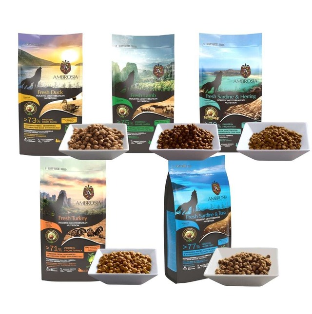 【AMBROSIA(アンブロシア)について】 「世界で最もヘルシーな食事」として注目される伝統的な地中海食にヒントを得て、健康的な犬猫の為の地中海食を提案します。 「アンブロシア」= ギリシャで古代より言い伝えられる「神々の食べ物」。その風味は神聖で、その香りは人々を虜にしていました。アンブロシアのように健康的で魅力的な美味しさが犬や猫を虜にする食べ物となることを目指して「アンブロシアペットフード」は命名されました。 【アンブロシアHMN(ホリスティックメディテラニアンニュートリション)の特徴】 古代ギリシャから伝わる地中海食の特徴である「オリーブオイル」「ハーブ」「野菜」「白身の動物性タンパク」を使用したフードです。 ・アレルギーを考慮して「シングルプロテイン」 ・タンパク質は71%が動物性、生肉&乾燥肉の美味しさ ・主原料タンパク質と同じ脂肪を使用 ・ギリシャ産オリーブオイルを使用 ・地中海産野菜、ハーブ、フルーツ使用 ・グレインフリー 地中海食の恩恵をより受けるための工夫としてフードローテーションして与えることをおすすめします。 アンブロシア HMNターキー(オリーブオイル入り) ★ 成犬、シニア犬、体重管理のパートナーにオススメ ★ 皮膚・被毛と関節が気になるパートナーにオススメ ★ アレルギーが気になる成犬のパートナーにオススメ ★ お肉が好きな成犬のパートナーにオススメ ★ タンパクの71%以上がターキー ★ コンドロイチン250mg/kg ・ グルコサミン500mg/kg 生産地 オランダ/フランス サイズ 小粒 8㎜~11㎜位(原材料の収穫時期により発泡度合いに変化があります) 素材 ターキー(30%)、サツマイモ、ドライターキータンパク(14%)、エンドウ豆、ターキーの脂肪(4%)、加水分解されたターキータンパク(3%)、ドライルツェルン、ビートパルプ、ドライチコリ(イヌリンとフルクトオリゴ糖の供給源として;1%)、オリーブオイル(0.5%)、亜麻仁、塩化コリン、MSM(メチルスルホニルメタン;0.15%)、タウリン、塩酸グルコサミン(500mg/kg)、コンドロイチン硫酸塩(250mg/kg)、ドライアップル、ドライトマト、フェヌグリーク、ドライ梨、ドライオレンジ、オレガノ、タイム、プロバイオティクス(エンテロコッカス・フェシウム)、ビタミンE(一部保存料として)、ビタミンC、亜鉛、鉄、マンガン、ビタミンB12、ビオチン、ナイアシン、パントテン酸、ビタミンA、ビタミンB2、銅、ビタミンB1、ビタミンB6、ヨウ素、葉酸、セレン、ビタミンD3 成分表 粗タンパク質/26.00% 粗脂肪/14.00% 粗繊維/4.50% 粗灰分/7.00%以下 水分/9.00%以下 カルシウム/1.40% リン/0.90% カロリー100g/Kcal/360.1kcal/100g 成分(その他) オメガ 3 脂肪酸 0,6%, オメガ 6 脂肪酸 2,3%, 地中海食の一般定義 良質な白身肉(魚や鶏肉等 低脂肪)を中心に、 赤身肉はほどほどに 新鮮な野菜・ハーブ・フルーツを毎日食べる 健康に良い脂肪・油(オリーブオイル)を毎日食べる 適度な運動をする 食事を家族や友人と楽しむ 等の食習慣 白身のお肉(魚介類・鶏・ウサギ等)を推奨し赤身のお肉は食べすぎず。 野菜・フルーツ・ハーブ・(オリーブオイル)は毎日といった栄養バランスを重視し、健康的な”ペットの地中海食”をアンブロシアは目指します。 ※1993年ハーバード大学・WHOと協力して 米NPO法人Oldwayが作成