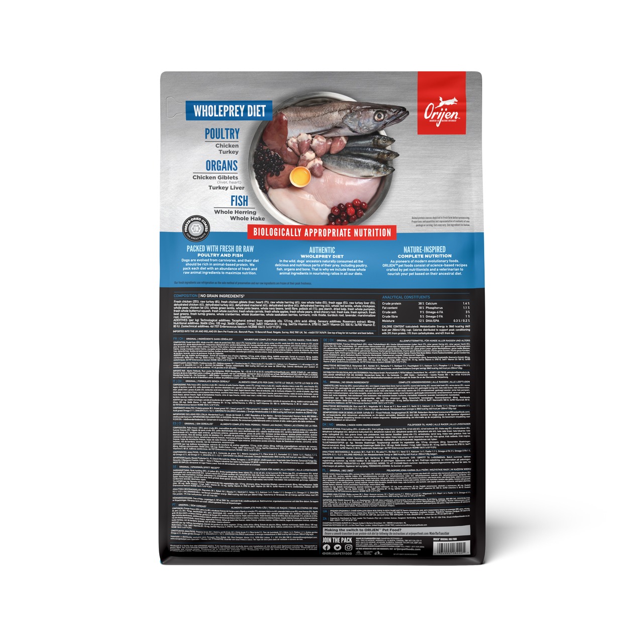 新鮮鶏肉 (25%), 生七面鳥肉 (8%), 新鮮鶏内臓 (レバー, 心臓) (7%), 生の丸ごとニシン (6%), 生の丸ごとヘイク (5%), 新鮮卵 (5%), 生七面鳥レバー (5%), ディハイドレート鶏肉 (4%), ディハイドレート七面鳥肉 (4%), ディハイドレートサバ (4%), ディハイドレートイワシ (4%), ディハイドレートニシン (4%), 丸ごと赤レンズ豆, 丸ごとヒヨコ豆, 丸ごとエンドウ豆, 鶏脂肪 (3%), 丸ごと緑レンズ豆, 丸ごとピント豆, 丸ごと白インゲン豆, レンズ豆繊維, ポロック油 (1%), エンドウ豆スターチ, 乾燥ケルプ, 新鮮丸ごとカボチャ, 新鮮丸ごとバターナッツスクワッシュ, 新鮮丸ごとズッキーニ, 新鮮丸ごとニンジン, 新鮮丸ごとリンゴ, 新鮮丸ごと洋梨, 乾燥チコリールート, 新鮮ケール, 新鮮ホウレン草, 新鮮ビートの葉, 新鮮カブラ菜, 丸ごとクランベリー, 丸ごとブルーベリー, 丸ごとサスカトゥーンベリー, ターメリック, オオアザミ, ゴボウ, ラベンダー, マシュマロルート, ローズヒップ 酸化防止剤: 植物油から抽出したトコフェロール: 121mg, クエン酸: 40mg, ローズマリーエキス: 80mg 添加栄養素 (1kgあたり): 3b606 (亜鉛: 105mg), 3b406 (銅: 11mg), 3a821 ビタミンB1: 10mg, 3a672a ビタミンA: 3750 IU, 3a671 ビタミンD3: 500 IU, 3a700 ビタミンE: 80 IU 添加腸球菌: 4b1707 エンテロコッカスフェシウム菌 NCIMB 10415 1x10^9 CFU