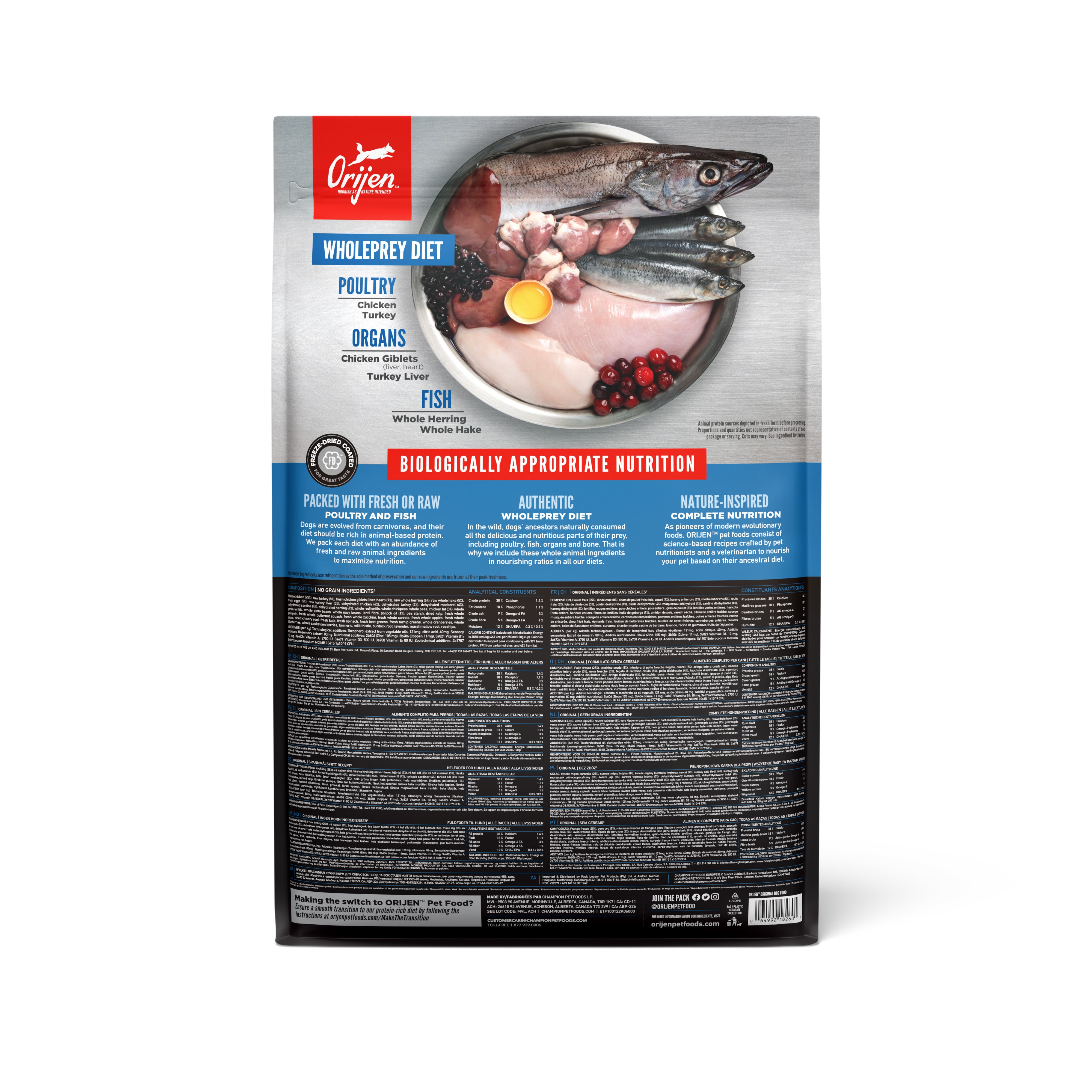 犬は祖先とされるハイイロオオカミのように、栄養豊富でさまざまな種類の動物原材料を丸ごと食べられるような身体構造をしていると言われています。オリジン・オリジナルは放し飼いで健康的に育った鶏や七面鳥、天然魚、平飼い卵などの高品質な動物原材料を使用し、その3分の2は新鮮または生もの。新鮮な食材をオリジン自社キッチンで丁寧に調理することで、鮮度が良く栄養たっぷりのドッグフードが出来上がるのです。肉、内臓、軟骨、骨を丸ごと使用することで自然本来の栄養素を再現しています。他にもフリーズドライのレバーを配合し、高品質なたんぱく質と栄養を含んだオリジン・オリジナル。自然に近く愛犬が喜ぶ風味をお届けします。