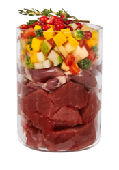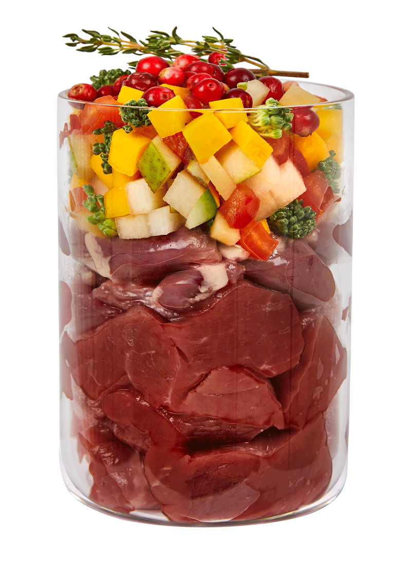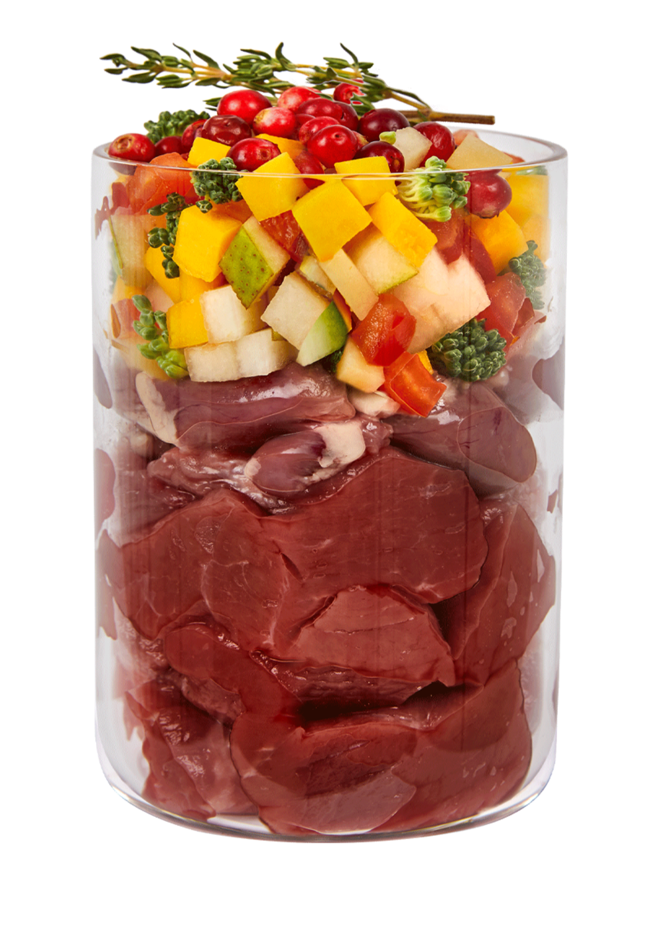 ★ 柔らかい鹿肉のグヤージュと鶏の心臓、角切り野菜&フルーツ入り