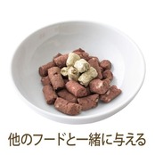 フードにトッピングして、3倍量の水(37℃以下)を加えて与えてください。 そのまま、おやつとして、また、崩してふりかけとして、与えることもできます。