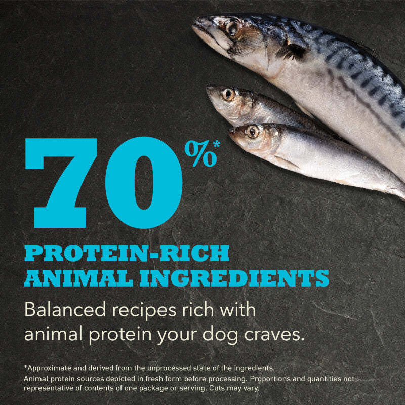 生の丸ごとニシン (13%), 生サーモン (13%), 生カレイ (7%), ニシンミール (7%), サーモンミール (7%), アオギスミール (7%), 丸ごと赤レンズ豆, 丸ごとヒヨコ豆, 丸ごとグリーンピース, 丸ごと緑レンズ豆, フィッシュオイル (6%), 生の丸ごとヘイク (5%), 生の丸ごとメバル (5%), 丸ごとピント豆, 丸ごとイエローピース, エンドウ豆スターチ, ヒマワリ油, レンズ豆繊維, 乾燥ケルプ, 酵母 (出芽酵母), 新鮮丸ごとカボチャ, 新鮮丸ごとバターナッツスクワッシュ, 新鮮丸ごとニンジン, 新鮮丸ごとリンゴ, 新鮮丸ごと洋梨, 新鮮丸ごとズッキーニ, 新鮮ケール, 新鮮ホウレン草, 新鮮カブラ菜, 新鮮ビートの葉, 丸ごとクランベリー, 丸ごとブルーベリー, 乾燥チコリールート, ターメリック, サルサパリラルート, アルテアルート, ローズヒップ, ジュニパーベリー