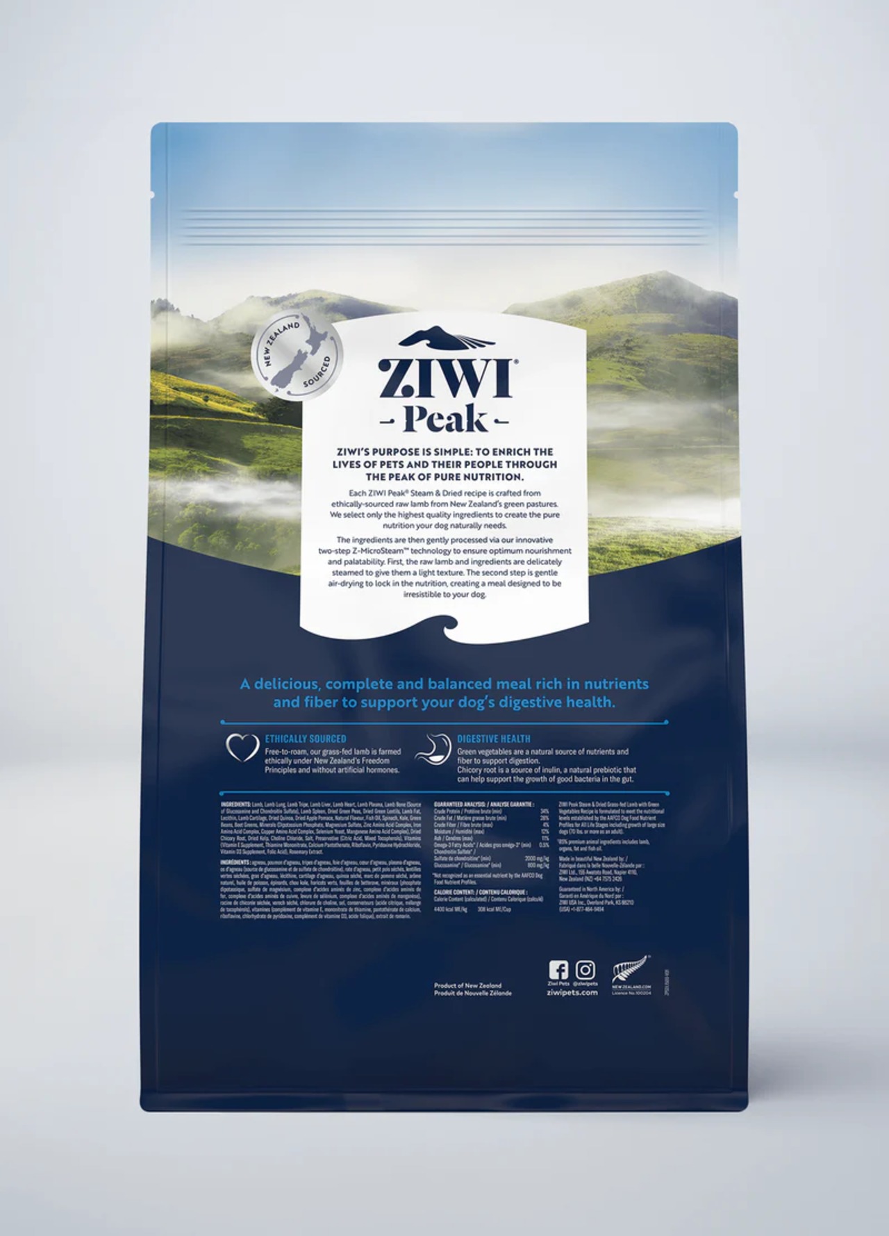 ニュージーランドの緑豊かな牧草地で倫理的な方法で調達されたラム生肉と、消化器官の健康維持をサポートするホウレン草、ケール、サヤインゲンとチコリルートのブレンドを使用して作られています。革新的な2段階のZ-MicroSteam™製法により、ゆっくりマイクロスチームし、丁寧にエアドライすることで、最適な栄養と嗜好性を提供します。