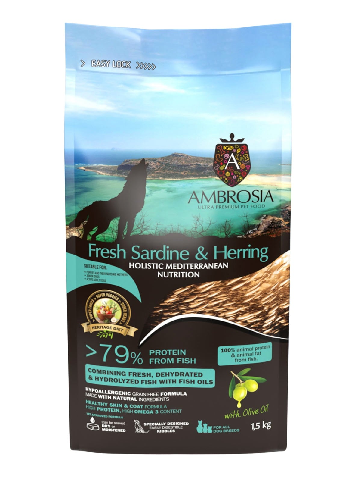 素材 イワシ(30%)、ドライニシンタンパク(20%)、サツマイモ、エンドウ豆、サーモンオイル(5%)、ココナッツオイル(4%)、加水分解されたサーモンタンパク(3%)、ビートパルプ、オリーブオイル、ドライルツェルン、ドライチコリ(イヌリンとフルクトオリゴ糖の供給源として)(0.5%)、亜麻仁、塩化コリン、マンナンオリゴ糖(0.15%)、タウリン、ドライリンゴ、ドライトマト、フェヌグリーク、ドライ梨、ドライオレンジ、オレガノ、タイム、プロバイオティクス(エンテロコッカス・フェシウム)、ビタミンE(一部保存料として)、ビタミンC、鉄、亜鉛、ビタミンB12、ビオチン、ナイアシン、パントテン酸、ビタミンA、ビタミンB2、銅、マンガン、ビタミンB1、ビタミンB6、ヨウ素、葉酸