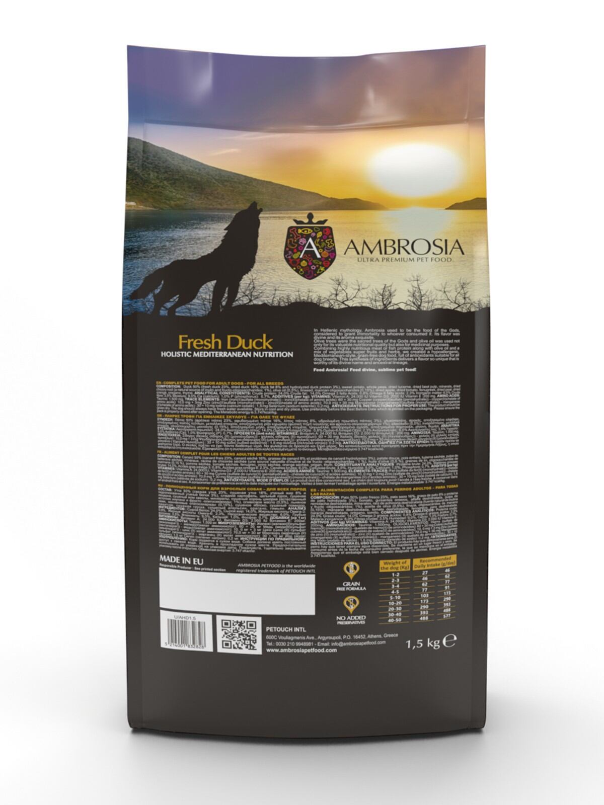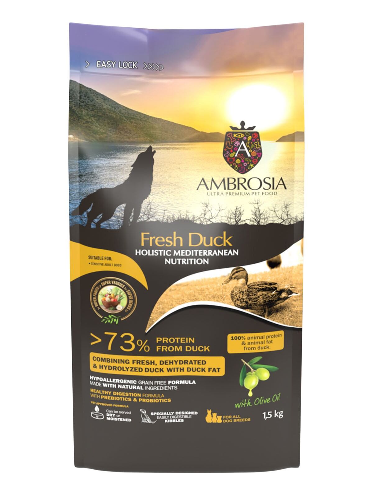 素材 ダック(23%)、サツマイモ、ドライダック(16%)、エンドウ豆、ダックの脂肪(8%)、加水分解されたダックタンパク(3%)、ドライルツェルン、ビートパルプ、ドライチコリ(イヌリンとフルクトオリゴ糖の供給源として;1%)、オリーブオイル(0.5%)、亜麻仁、塩化コリン、マンナンオリゴ糖(0.15%)、タウリン、ドライアップル、ドライトマト、フェヌグリーク、ドライ梨、ドライオレンジ、オレガノ、タイム、プロバイオティクス(エンテロコッカス・フェシウム)、ビタミンE(一部保存料として)、ビタミンC、亜鉛、鉄、マンガン、ビタミン B12、ビオチン、ナイアシン、パントテン酸、ビタミンA、ビタミンB2、銅、ビタミンB1、ビタミンB6、ヨウ素、葉酸、セレン、ビタミンD3