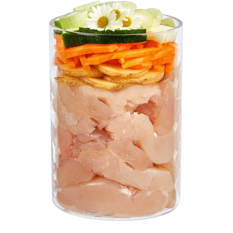 素材 鶏の筋肉(30%)、鶏の胃袋 (26%)、人参、ジャガイモ、ズッキーニ(7%)、フェンネル(3.5%)、セロリ、イチゴ(2%)、ブルーベリー、ココナッツ粉(1%)、亜麻仁油、MCTオイル、オイスターシェル*、ミネラルアース*、カモミール*(0.5%)、サイリウムハスク(オオバコの殻)*、亜麻仁、キャラウェイ*、ヤロウ*、イチョウ*、Emiko® EM-ブレンド(0.2%)、セイボリー*、アニス*、海藻*、ビタミン(A、D3、E、B1、B2、B6、B12)、ビオチン、パントテン酸、葉酸、ナイアシン、鉄、銅、マンガン、ヨウ素、亜鉛、カルシウム、リン、マグネシウム、塩化ナトリウム 、カリウム