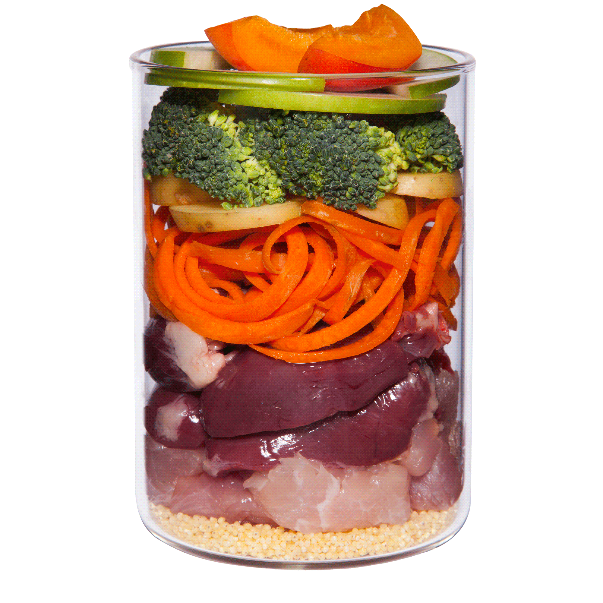 素材 七面鳥の心臓(26%)、七面鳥の胃袋(14%)、にんじん、じゃがいも(11%)、七面鳥のレバー(8%)、梨(7%)、キビ、七面鳥の赤身肉(4%)、七面鳥の皮(3%)、アプリコット、ブロッコリーの小花(1.5%)、レープシードオイル、オイスターシェル*、ビール酵母*、粉砕した亜麻仁*、バジル*、パセリ*、ミネラルクレイ*、海藻*、ミネラル類 *乾燥