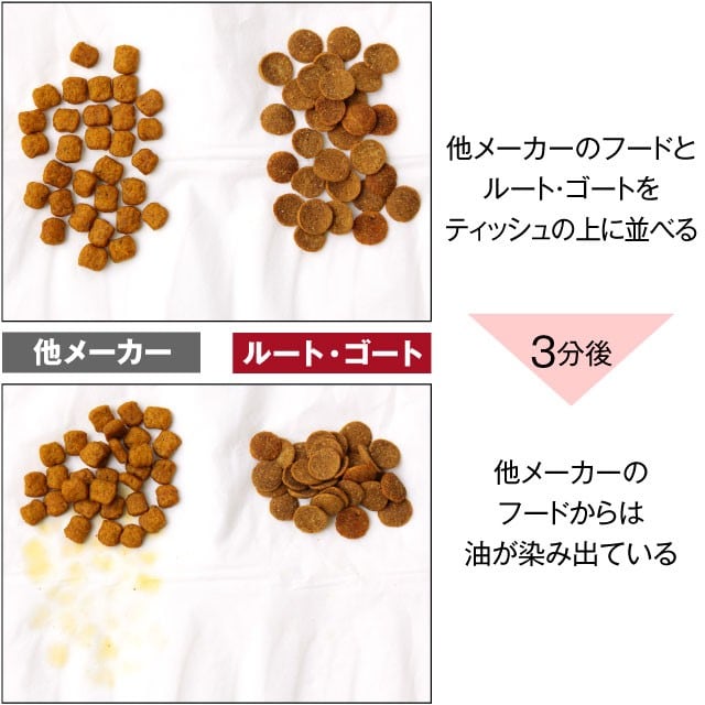 現地のワンちゃん向けの仕様であり、油やニオイが強めなので、日本に輸入された段階ですでに酸化している。日本向けの商品なので油が控えめ。さらにオーストラリアの酸化のスペシャリスト指導のもと、徹底した酸化防止対策。