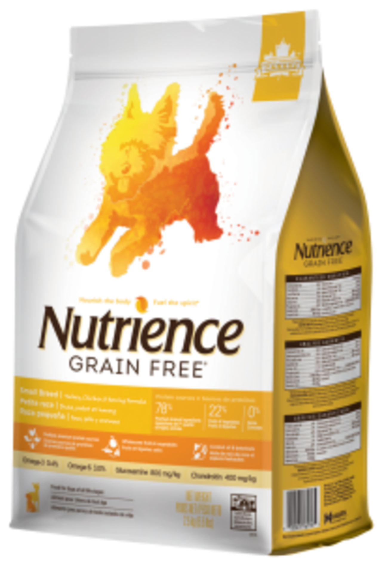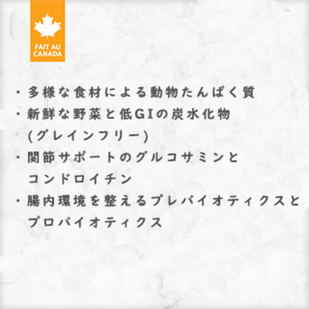骨抜きターキー、ターキーミール、チキンミール、グリーンピース、サツマイモ、レンズ豆、骨抜きチキン、骨抜きニシン、チキン脂肪(天然酸化防止剤ミックストコフェロールで保存)、全卵、天日干しアルファルファ粉、タピオカ、天然チキンフレーバー、チキンレバー、サーモンオイル、ココナッツオイル、かぼちゃ、バターナッツスクオッシュ、にんじん、ほうれん草、ブロッコリー、りんご、洋梨、ブルーベリー、クランベリー、ざくろ、ジュニパーベリー抽出物、生姜、フェンネル、ペパーミント葉、カンゾウ根、ターメリック、ビタミン類(E、C、A、ナイアシン、パントテン酸カルシウム、イノシトール、B2、B6、B1、ビオチン、B12、D3、葉酸)、ミネラル類(酸化亜鉛、亜鉛たんぱく質化合物、鉄たんぱく質化合物、硫酸鉄、銅たんぱく質化合物、硫酸銅、マンガンたんぱく質化合物、酸化マンガン、ヨウ素酸カルシウム、亜セレン酸ナトリウム)、リン酸水素カルシウム、塩、塩化カリウム、レシチン、チコリー根抽出物、塩化コリン、メチオニン、乾燥昆布、イースト抽出物、グルコサミン塩酸塩、ローズマリー抽出物、ユッカ・シジゲラ抽出物、タウリン、リジン、コンドロイチン硫酸、カルニチン、乾燥L.プランタラム菌発酵物、乾燥E.フェシウム菌発酵物、乾燥バチルス・サブティリス菌発酵物、乾燥B.アニマリス菌発酵物、乾燥L.カゼイ菌発酵物、乾燥L.ヘルベティカス菌発酵物、乾燥B.ロンガム菌発酵物、乾燥L.アシドフィルス菌発酵物