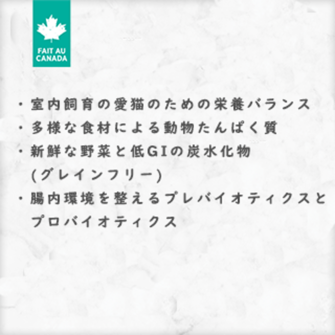 新鮮なターキー(七面鳥)とチキン、ダックを使い、室内飼いや肥満気味の愛猫のために栄養バランスを調整した、良質のタンパク質と脂質を含む穀物不使用(グレインフリー)のレシピです。