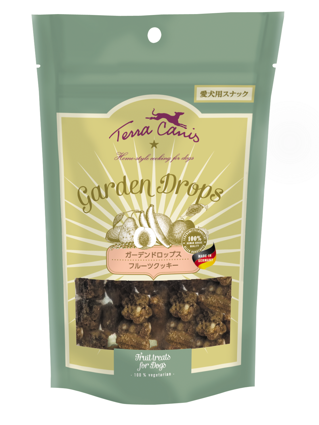 素材 ドライバナナ(15%)、ドライアプリコット(15%)、ドライパパイヤ(12%)、ドライアップル(12%)、ココナッツ粉(10%)、ドライプラム(10%)、ポテトフレーク、ドライペアー(梨)(7%)、ドライピーチ(6%)、リンゴンベリー(3%)