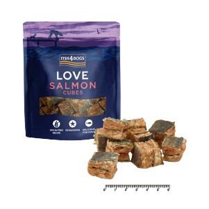 人気のサーモンとホワイトフィッシュの皮をキューブ状に成形したトリーツです。