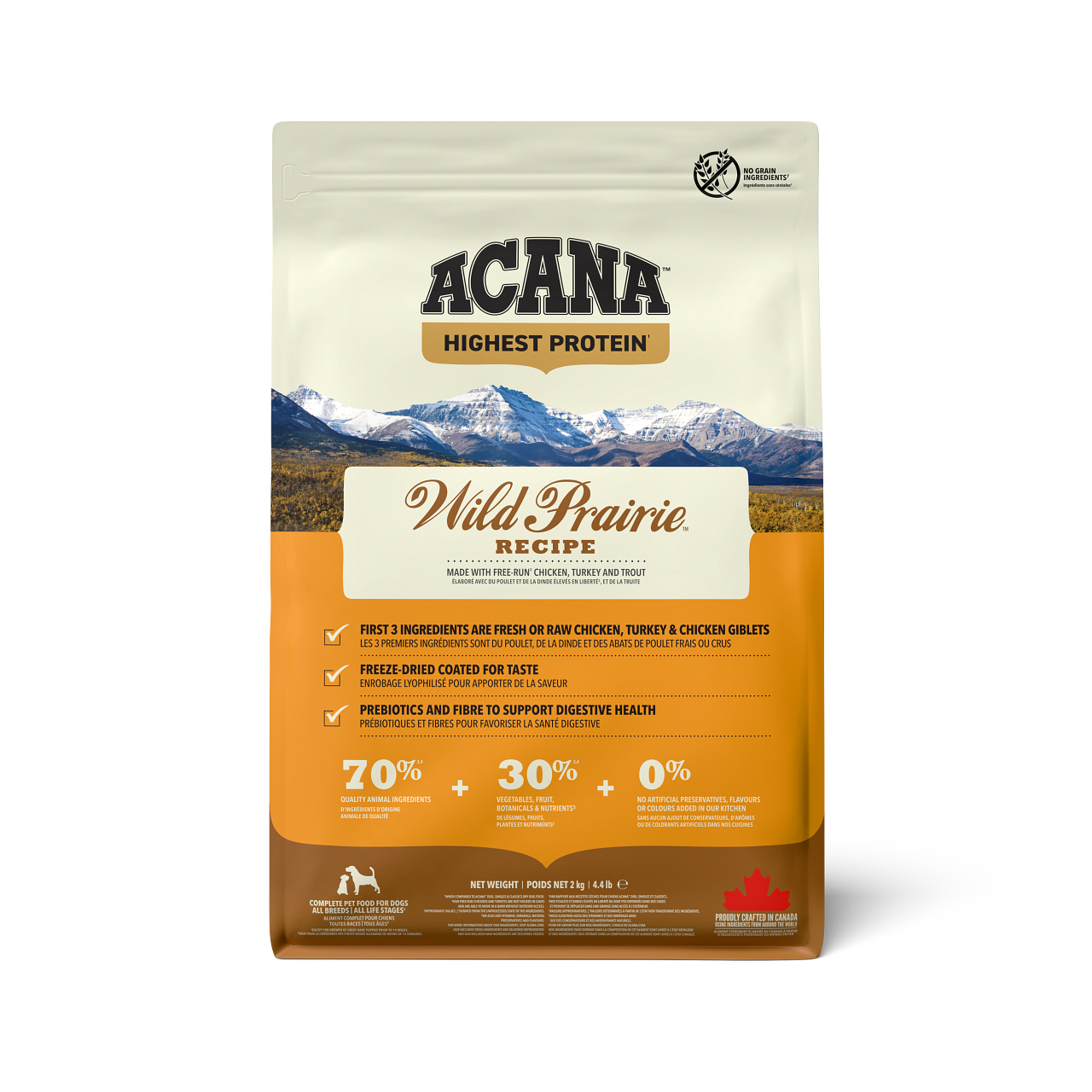 アカナのドッグフードは、全ての原材料にこだわり最高品質のものを使用。「アカナ ハイエストプロテイン ワイルドプレイリードッグレシピ」はアカナのラインナップの中でも特に高タンパク質なドッグフードです。放し飼いでのびのび育った鶏や七面鳥、天然魚や環境に配慮した方法で育てられた養殖魚など高品質な動物原材料を70%、毎日キッチンに届けられる新鮮なフルーツや野菜、ハーブを30%の比率で配合しています。人工着色料、人工香料、人工保存料無添加で、ペットにとって自然な食事を再現しました。消化率が高い鶏肉と卵を使用しています。人気が高いスタンダードタイプです。