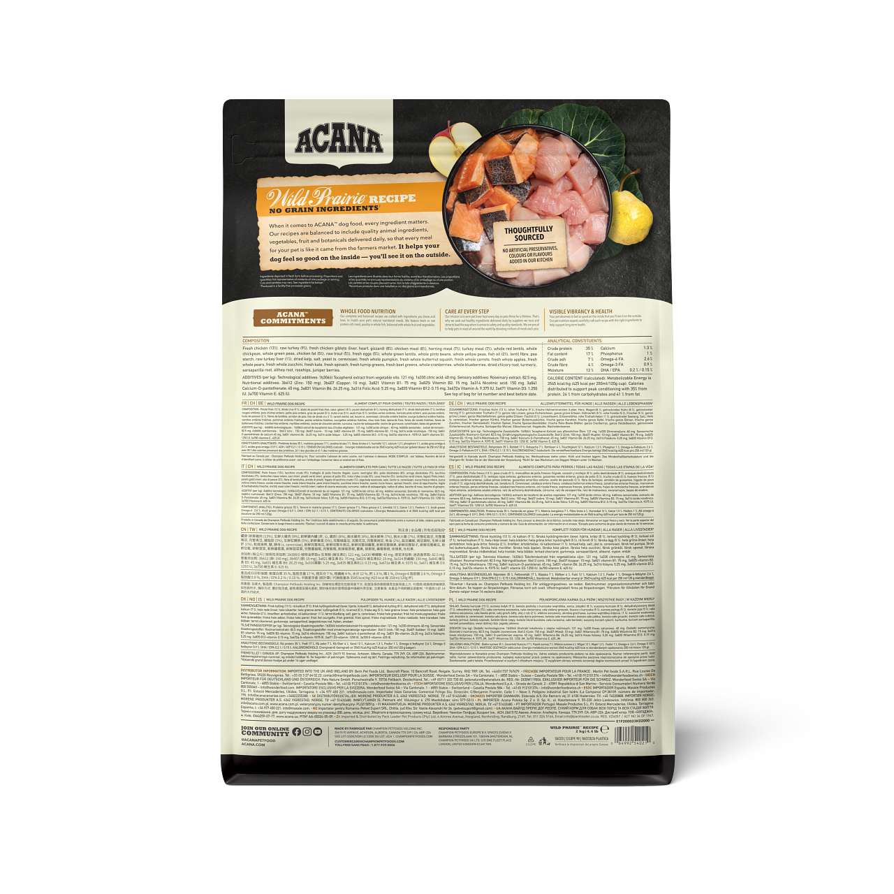 新鮮鶏肉 (11%), 生七面鳥肉 (9%), 新鮮鶏内臓 (レバー, 心臓) (9%), 乾燥鶏肉 (9%), 乾燥ニシン (9%), 丸ごとグリーンピース, 丸ごと赤レンズ豆, 丸ごとヒヨコ豆, 湖で漁獲された生の淡水魚* (6%), 乾燥七面鳥肉 (6%), 卵 (4%), 鶏脂肪 (4%), 丸ごと緑レンズ豆, 丸ごとピント豆, 丸ごとイエローピース, レンズ豆繊維, フィッシュオイル (2%), エンドウ豆スターチ, 生七面鳥レバー (1%), 乾燥ケルプ, 塩, フリーズドライ鶏肉・鶏レバー, 新鮮丸ごとカボチャ, 新鮮丸ごとバターナッツスクワッシュ, 新鮮丸ごとニンジン, 新鮮丸ごとリンゴ, 新鮮丸ごと洋梨, 新鮮丸ごとズッキーニ, 乾燥チコリールート, 新鮮ケール, 新鮮ホウレン草, 新鮮カブラ菜, 新鮮ビートの葉, 丸ごとクランベリー, 丸ごとブルーベリー, 丸ごとサスカトゥーンベリー, ターメリック, オオアザミ, ゴボウ, ラベンダー, マシュマロルート, ローズヒップ *生のタリビー、白身魚、ノーザンパイク、ボラを混ぜたもの酸化防止剤: 植物油から抽出したトコフェロール: 121mg, クエン酸: 40mg, ローズマリーエキス: 80mg 添加栄養素(1kgあたり): 3b606 (亜鉛: 150mg), 3b406 (銅: 11mg), 3a821 ビタミンB1: 25mg, 3a841 ビタミンB5: 8mg, 3a831 ビタミンB6: 7.5mg, 3a700 ビタミンE: 50 IU 添加腸球菌: 4b1707 エンテロコッカスフェシウム菌 NCIMB 10415 2.2x10^6 CFU