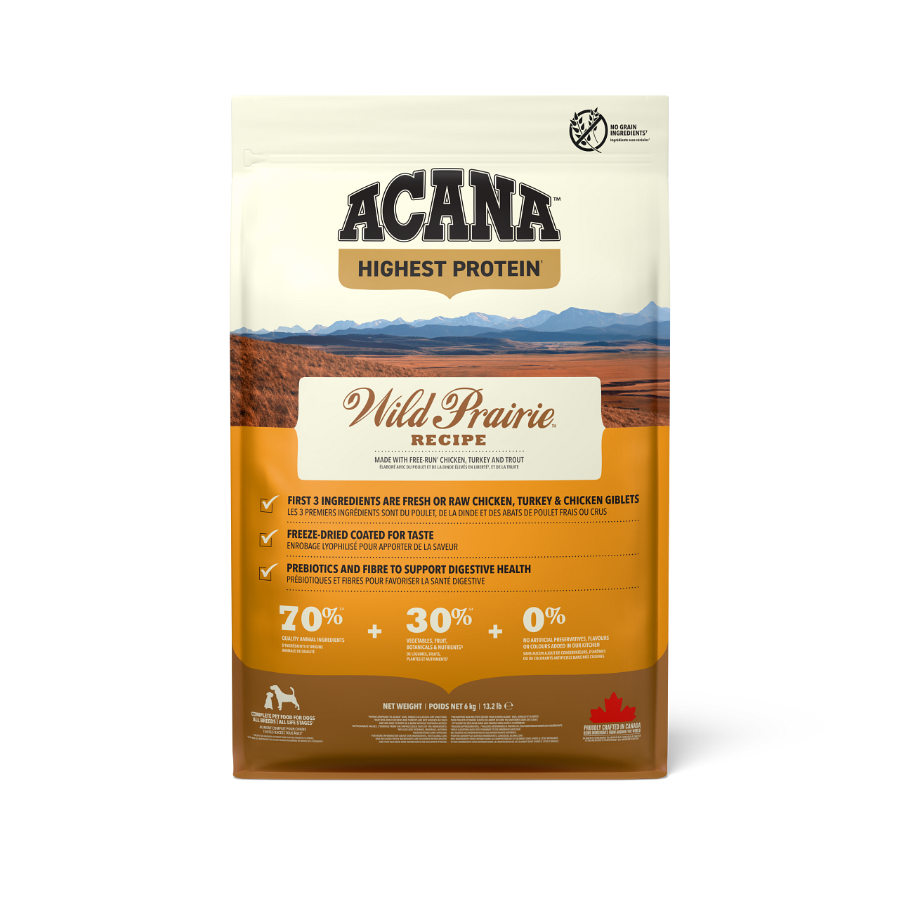 アカナのドッグフードは、全ての原材料にこだわり最高品質のものを使用。「アカナ ハイエストプロテイン ワイルドプレイリードッグレシピ」はアカナのラインナップの中でも特に高タンパク質なドッグフードです。放し飼いでのびのび育った鶏や七面鳥、天然魚や環境に配慮した方法で育てられた養殖魚など高品質な動物原材料を70%、毎日キッチンに届けられる新鮮なフルーツや野菜、ハーブを30%の比率で配合しています。人工着色料、人工香料、人工保存料無添加で、ペットにとって自然な食事を再現しました。消化率が高い鶏肉と卵を使用しています。人気が高いスタンダードタイプです。