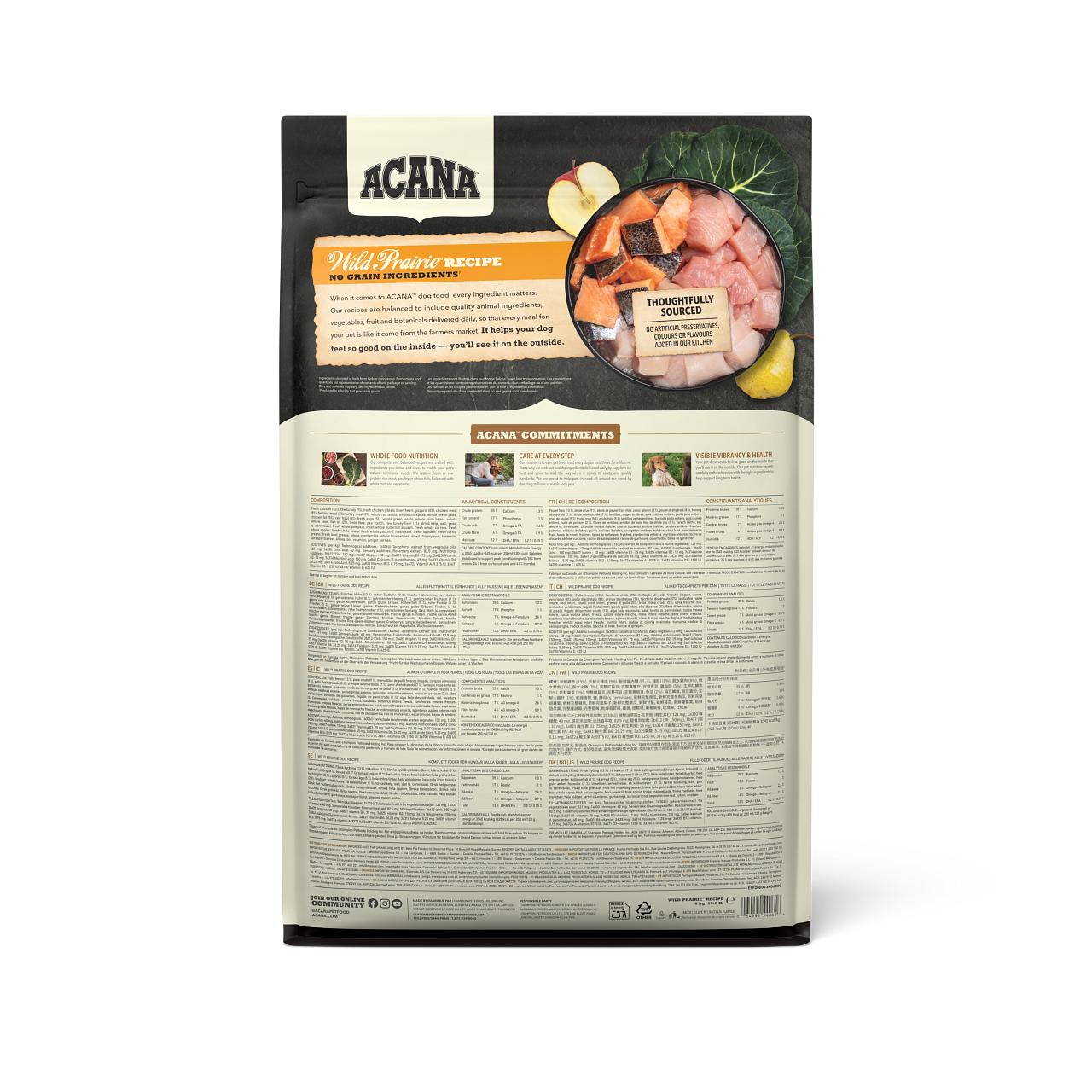 新鮮鶏肉 (11%), 生七面鳥肉 (9%), 新鮮鶏内臓 (レバー, 心臓) (9%), 乾燥鶏肉 (9%), 乾燥ニシン (9%), 丸ごとグリーンピース, 丸ごと赤レンズ豆, 丸ごとヒヨコ豆, 湖で漁獲された生の淡水魚* (6%), 乾燥七面鳥肉 (6%), 卵 (4%), 鶏脂肪 (4%), 丸ごと緑レンズ豆, 丸ごとピント豆, 丸ごとイエローピース, レンズ豆繊維, フィッシュオイル (2%), エンドウ豆スターチ, 生七面鳥レバー (1%), 乾燥ケルプ, 塩, フリーズドライ鶏肉・鶏レバー, 新鮮丸ごとカボチャ, 新鮮丸ごとバターナッツスクワッシュ, 新鮮丸ごとニンジン, 新鮮丸ごとリンゴ, 新鮮丸ごと洋梨, 新鮮丸ごとズッキーニ, 乾燥チコリールート, 新鮮ケール, 新鮮ホウレン草, 新鮮カブラ菜, 新鮮ビートの葉, 丸ごとクランベリー, 丸ごとブルーベリー, 丸ごとサスカトゥーンベリー, ターメリック, オオアザミ, ゴボウ, ラベンダー, マシュマロルート, ローズヒップ *生のタリビー、白身魚、ノーザンパイク、ボラを混ぜたもの酸化防止剤: 植物油から抽出したトコフェロール: 121mg, クエン酸: 40mg, ローズマリーエキス: 80mg 添加栄養素(1kgあたり): 3b606 (亜鉛: 150mg), 3b406 (銅: 11mg), 3a821 ビタミンB1: 25mg, 3a841 ビタミンB5: 8mg, 3a831 ビタミンB6: 7.5mg, 3a700 ビタミンE: 50 IU 添加腸球菌: 4b1707 エンテロコッカスフェシウム菌 NCIMB 10415 2.2x10^6 CFU