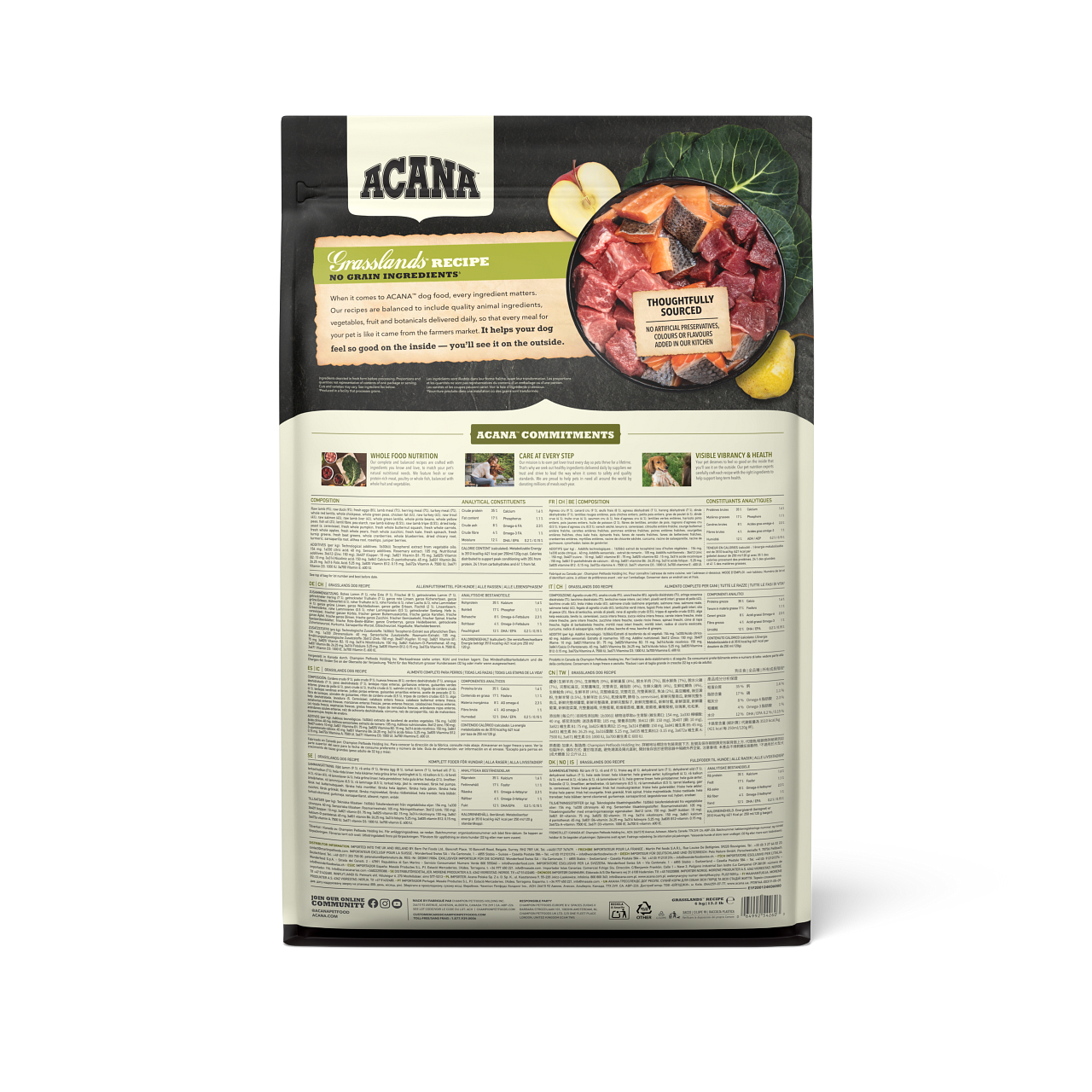生ラム肉 (8.5%), 生鴨肉 (8.5%), 卵 (8%), 乾燥ラム肉 (8%), 乾燥ニシン (7%), 乾燥七面鳥肉 (7%), 丸ごとグリーンピース, 丸ごと赤レンズ豆, 丸ごとヒヨコ豆, 湖で漁獲された生の淡水魚* (5%), フィッシュオイル (4%), 生ラムレバー (4%), 鴨レバー (4%), 生七面鳥肉 (4%), 丸ごと緑レンズ豆, 丸ごとピント豆, 丸ごとイエローピース, レンズ豆繊維, 鴨脂肪 (2%), エンドウ豆スターチ, 乾燥ケルプ, 新鮮丸ごとカボチャ, 新鮮丸ごとバターナッツスクワッシュ, 新鮮丸ごとニンジン, 新鮮丸ごとリンゴ, 新鮮丸ごと洋梨, 新鮮丸ごとズッキーニ, 乾燥チコリールート, フリーズドライ鴨肉・鴨レバー, フリーズドライラム肉・ラムレバー, 新鮮ケール, 新鮮ホウレン草, 新鮮カブラ菜, 新鮮ビートの葉, 丸ごとクランベリー, 丸ごとブルーベリー, 丸ごとサスカトゥーンベリー, ターメリック, オオアザミ, ゴボウ, ラベンダー, マシュマロルート, ローズヒップ *生のタリビー、白身魚、ノーザンパイク、ボラを混ぜたもの 酸化防止剤: 植物油から抽出したトコフェロール: 308mg, クエン酸: 40mg, ローズマリーエキス: 105mg 添加栄養素(1kgあたり): 3b606 (亜鉛: 150mg), 3b406 (銅: 11mg), 3a821 ビタミンB1: 25mg, 3a841 ビタミンB5: 8mg, 3a831 ビタミンB6: 7.5mg, 3a700 ビタミンE: 50 IU 添加腸球菌: 4b1707 エンテロコッカスフェシウム菌 NCIMB 10415 2.2x10^6 CFU