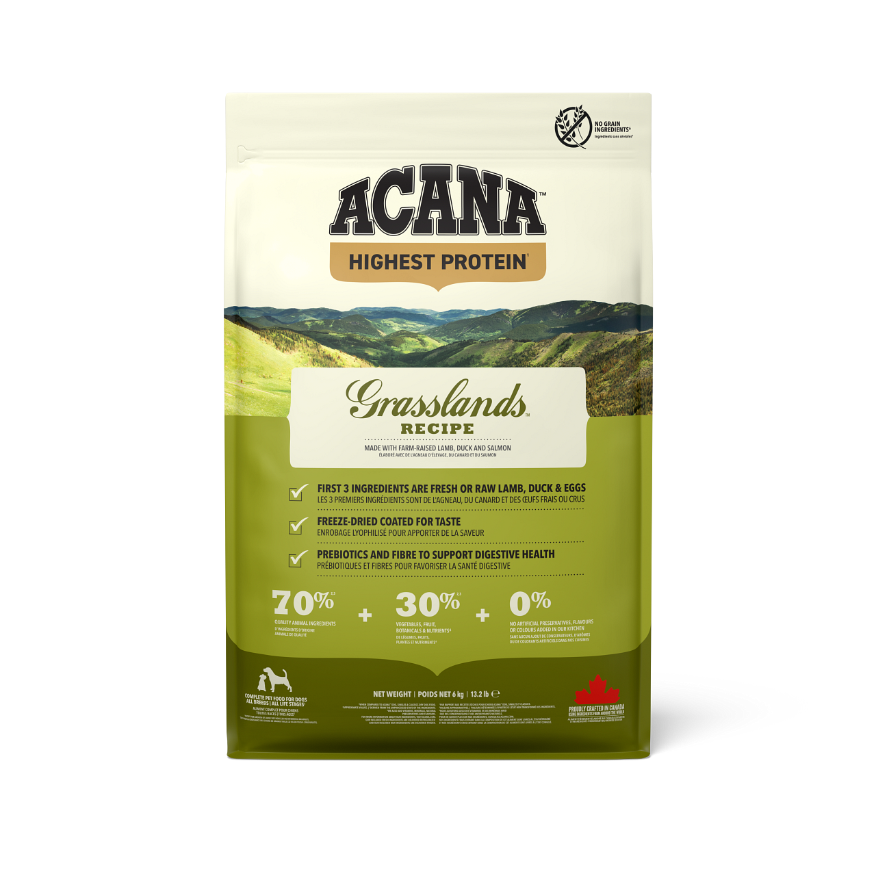 アカナのドッグフードは、全ての原材料にこだわり最高品質のものを使用。「アカナ ハイエストプロテイン グラスランドドッグレシピ」はアカナのラインナップの中でも特に高タンパク質な、羊肉を中心とした動物原材料を使ったドッグフードです。牧場でのびのびと飼育された子羊や鴨、卵、淡水魚などの高品質な動物原材料を70%、毎日キッチンに届けられる新鮮なフルーツや野菜、ハーブを30%の比率で配合しています。人工着色料、人工香料、人工保存料無添加で、ペットにとって自然な食事を再現しました。お腹が弱い子にオススメです。