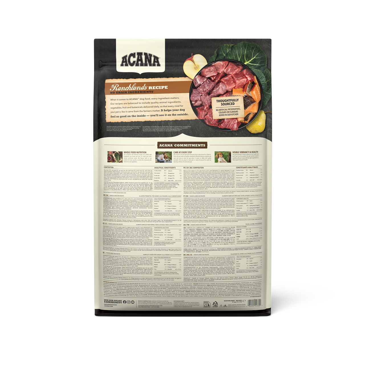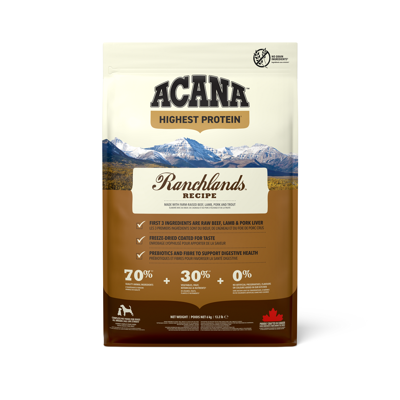アカナのドッグフードは、全ての原材料にこだわり最高品質のものを使用。「アカナ ハイエストプロテイン ランチランドドッグレシピ」はアカナのラインナップの中でも特に高タンパク質な、赤身肉をベースとしたドッグフードです。牧場でのびのびと飼育された牛、豚、子羊、淡水魚、バイソンなど高品質な動物原材料を70%、毎日キッチンに届けられる新鮮なフルーツや野菜、ハーブを30%の比率で配合しています。人工着色料、人工香料、人工保存料無添加で、ペットにとって自然な食事を再現しました。食べつきが良く偏食ぎみの子にオススメです。