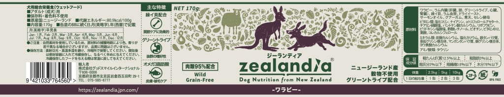 ワラビー、ラム内臓(肝臓、肺、グリーントライプ、心臓、腎臓)、緑イ貝、ラム血漿、ドライイースト、サーモンオイル、グアーガム、寒天、セレン酵母
