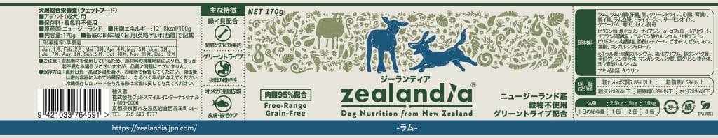ラム、ラム内臓(肝臓、肺、グリーントライプ、心臓、腎臓)、緑イ貝、ラム血漿、ドライイースト、サーモンオイル、グアーガム、寒天、セレン酵母