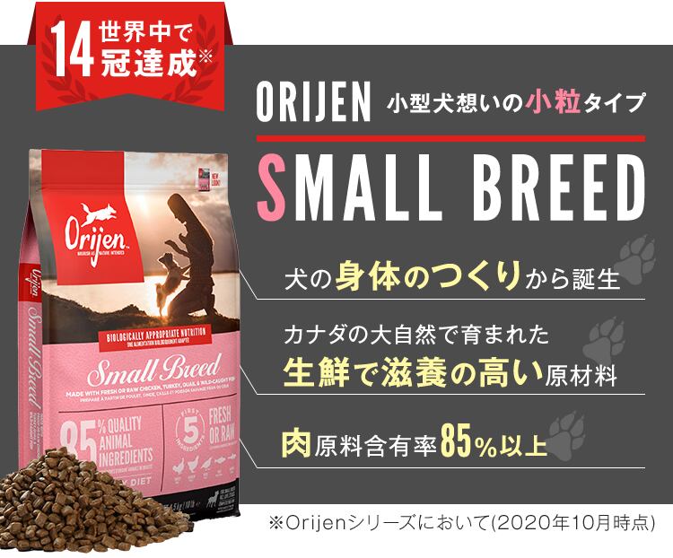 タンパク質豊富なレシピの力を借りて、最高の状態の栄養を提供し、犬の健康をサポートしましょう。小型犬には特定の栄養ニーズがあり、健康に育つためには生物学的に適切な食事が必要です。オリジンTMスモールブリードの食事は、小型犬向けに特別に作られており、放し飼い1の鶏肉と七面鳥、天然魚、そしてウズラから得られる栄養豊富なタンパク質を含んでいます。これらは、小型犬が食べやすいオリジナルの粒状に詰め込まれています。新鮮または生2のホールプレイ動物原料を豊富に含むオリジンフードは、最も栄養価が高くジューシーな獲物の部分を使用して、犬に必要な栄養を提供します。その結果、小型犬のための比類なき食事が完成しました。