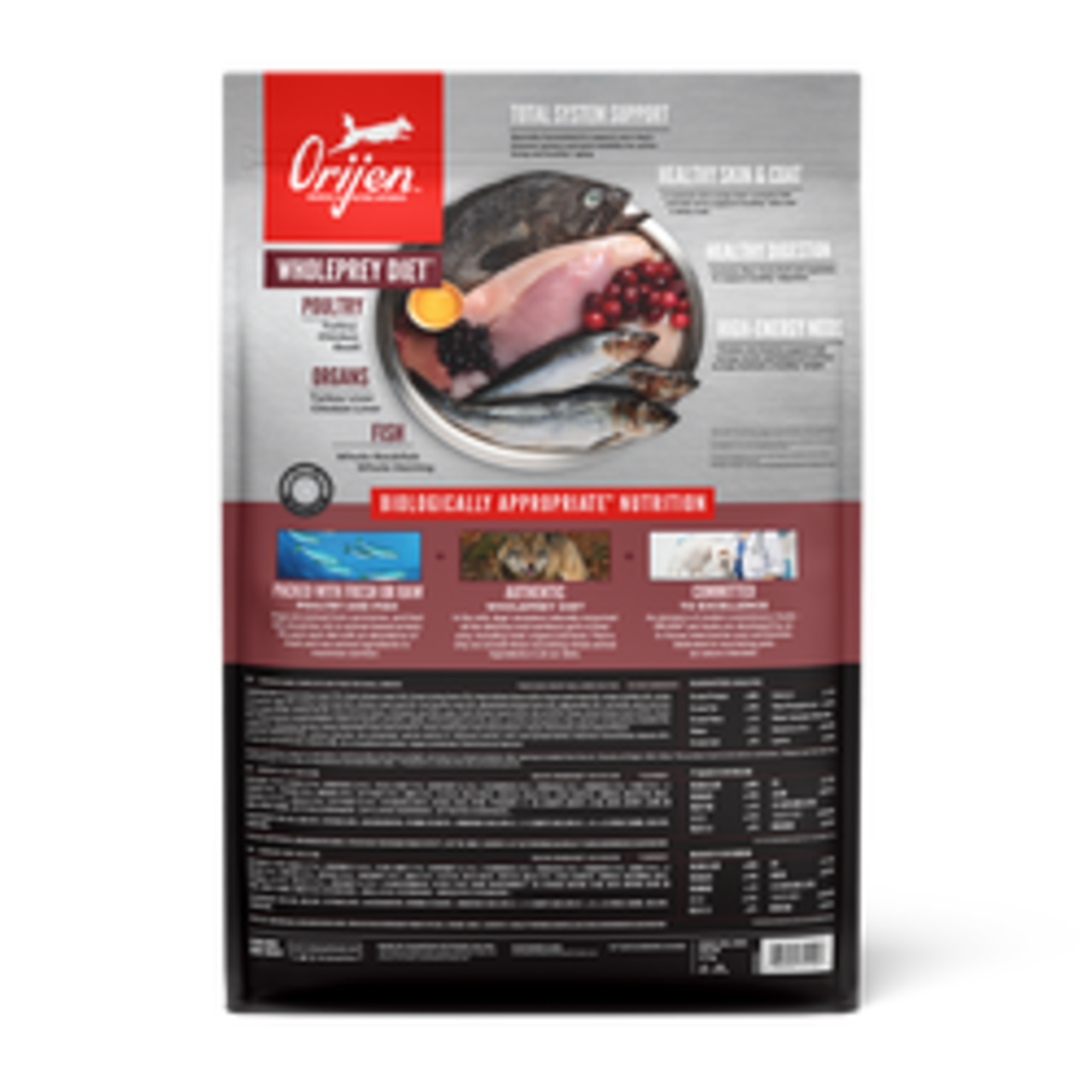 代謝エネルギーは3900 kcal/kg(250ml/120gのカップあたり468 kcal)で、そのうち40%がタンパク質、18%が炭水化物、42%が脂肪です。| オリジンスモールブリードは、全てのライフステージにおいて、FEDIAF(欧州ペットフード工業会連合)が定める栄養基準を満たすよう配合されています。涼しく乾燥した場所で保存してください。人間は食べられません。